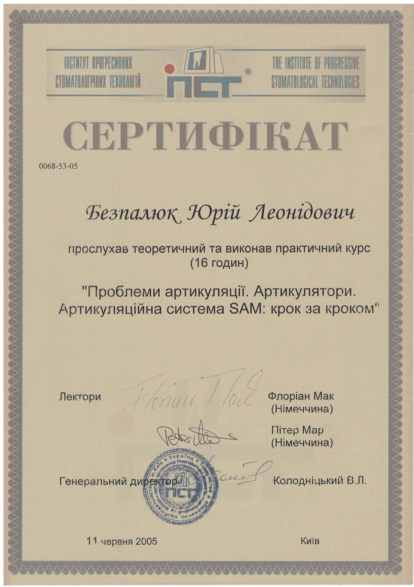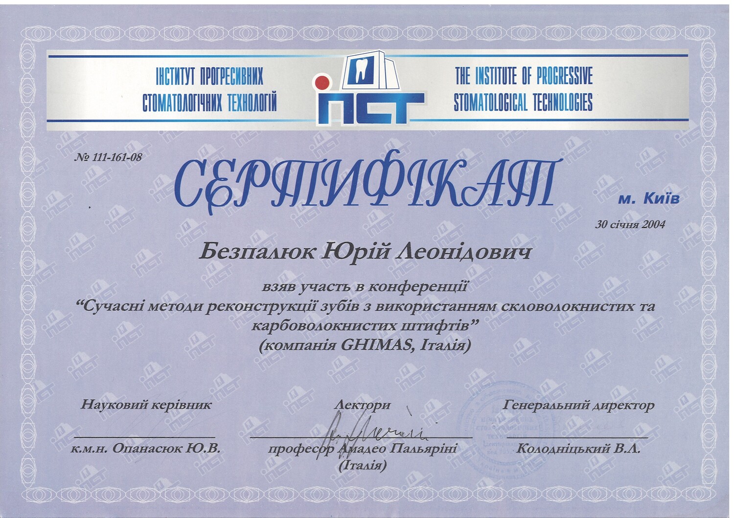 Лікар Юрій Леонідович – досвідчений стоматолог-ортопед- гнатолог з більш ніж 20-річним стажем роботи, який займається протезуванням зубів, а саме: коронками, протезами та вінірами. Також, він є лікарем-гнатологом і навчався у Віденській школі гнатології. Крім цього, він спеціалізується на технічній (лабораторній) ланці виготовлення ортопедичних конструкцій, що дозволяє йому розуміти процес виготовлення протезів та коронок і забезпечує високу якість виготовлення таких конструкцій.